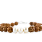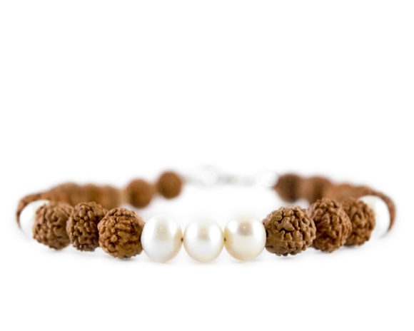 Materijali: netretirani riječni bijeli biseri 6-7mm i 7-8mm, certificirana prirodna netretirana zrna rudrakše 7mm, sajla, kopčica.