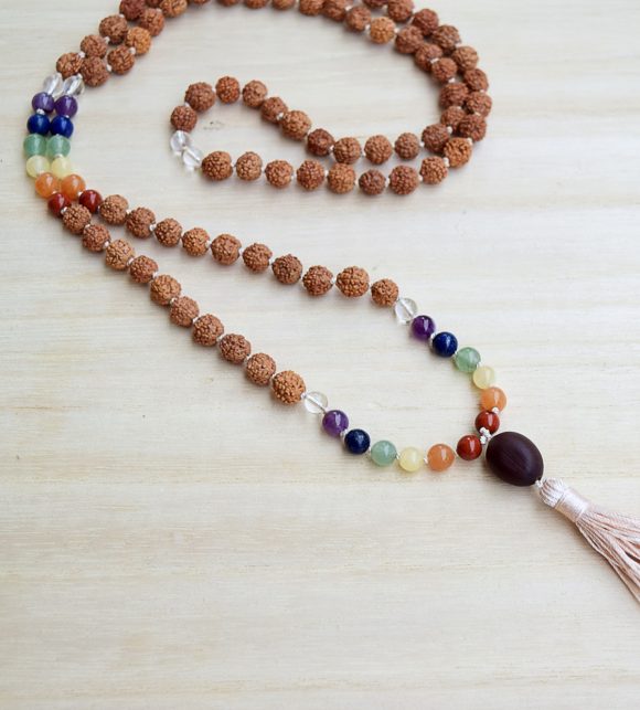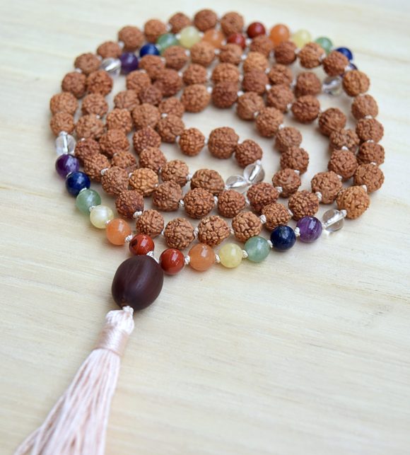 Materijali: netretirano poludrago kamenje A kvalitete 6mm: crveni jaspis, narančasti aventurin, žuti kalcit, zeleni aventurin, lapis lazuli, ametist, gorski kristal, netretirana certificirana zrna rudrakše 6-7 mm i lotos, 100 % prirodna svila.
