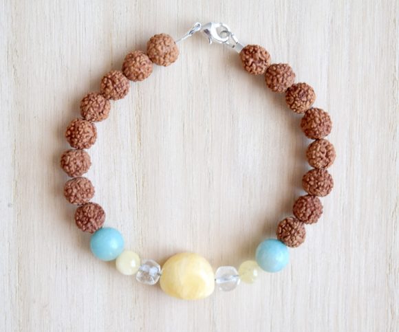 Materijali: netretirano poludrago kamenje A kvalitete: žuti kalcit 6mm i 8×10 mm, facetirani gorski kristal 6 mm, amazonit 8 mm, certificirana prirodna netretirana zrna rudrakše 6-7 mm, sajla, kopčica.