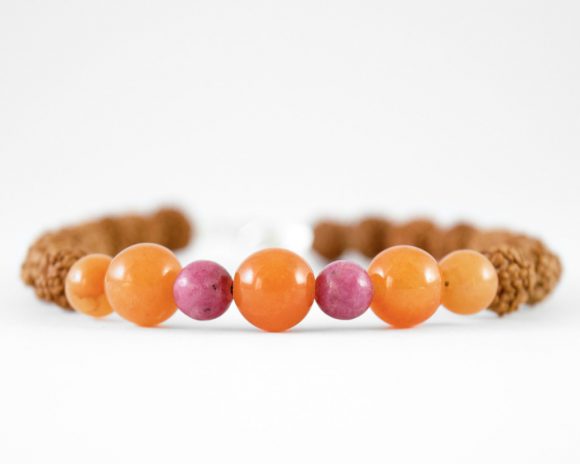 Materijali: netretirano poludrago kamenje AAA kvalitete: narančasti aventurin 6mm i 8mm, rodonit 6mm, netretirana prirodna zrna rudrakše 7mm, sajla, kopča.