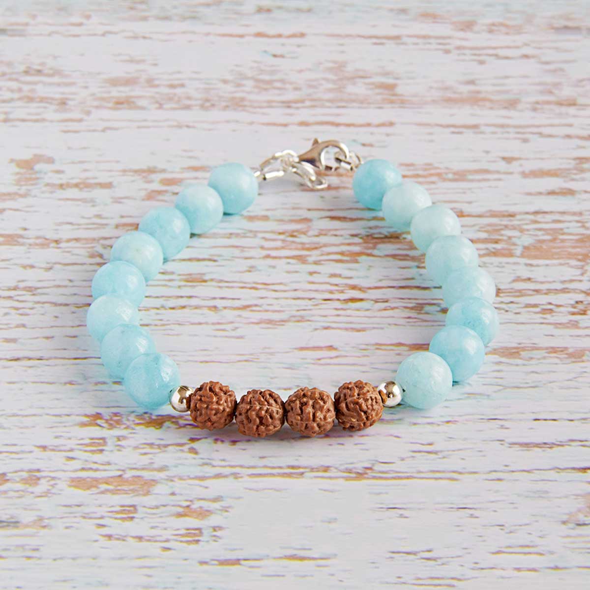 Narukvica s plavim ahatom, .925 srebrnim perlicama i rudrakšom ima jako opuštajuće i umirujuće djelovanje, poput pogleda na ljetno nebo bez oblačka i plaže koju oplahuje tirkizno more. Plavi ahat izuzetno je duhovan kamen koji donosi mir i spokoj. Umanjuje napetost, osjećaj osamljenosti i tjeskobe te opušta. Njegova suptilna iscjeljujuća energija će ti pomoći da postigneš ravnotežu i stabilnost te da pronađeš sreću.
