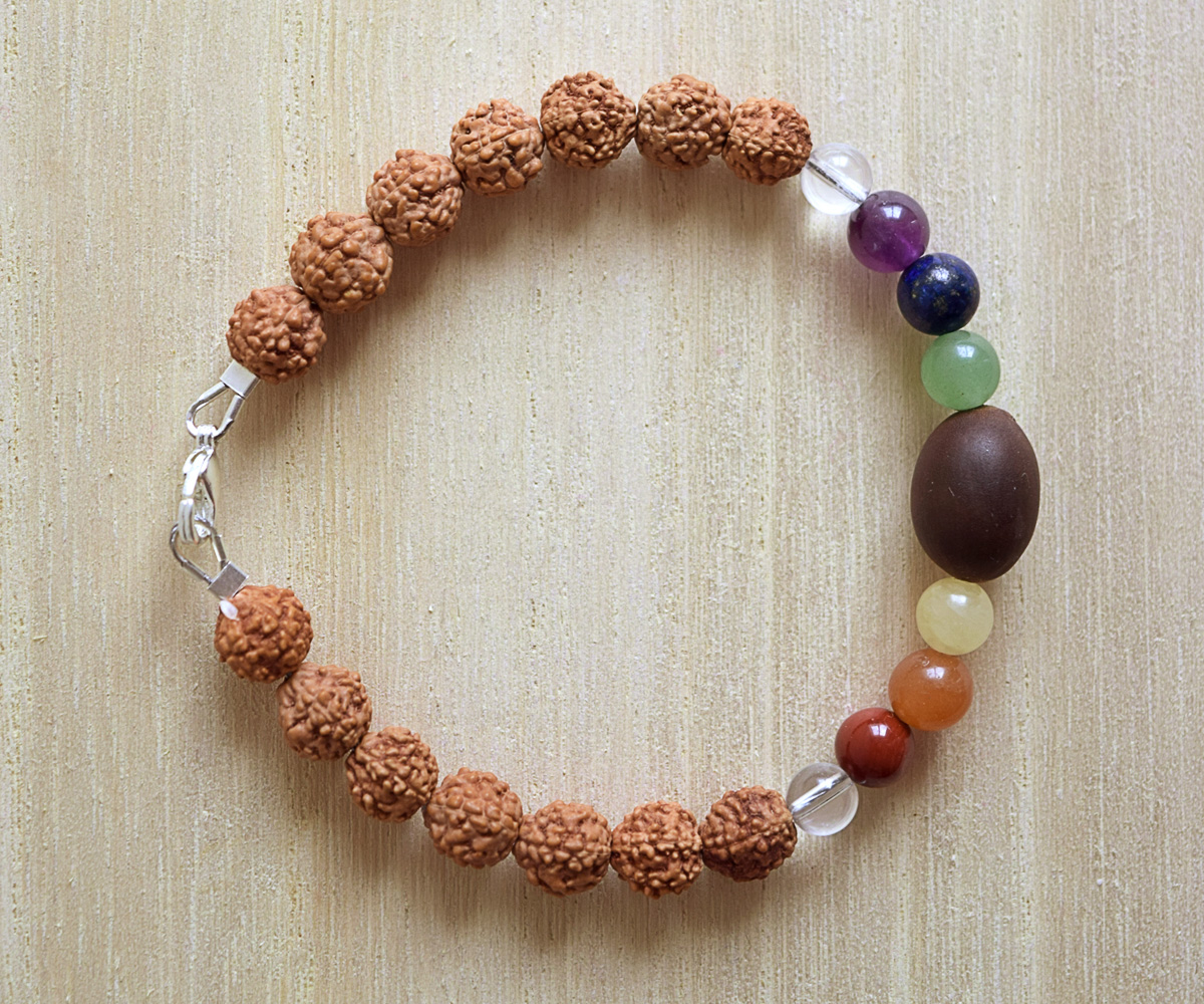 Materijali: netretirano poludrago kamenje A kvalitete 6mm: crveni jaspis, narančasti aventurin, žuti kalcit, zeleni aventurin, lapis lazuli, ametist, gorski kristal, netretirana certificirana zrna rudrakše 6-7 mm i lotos, kopčica, sajla.