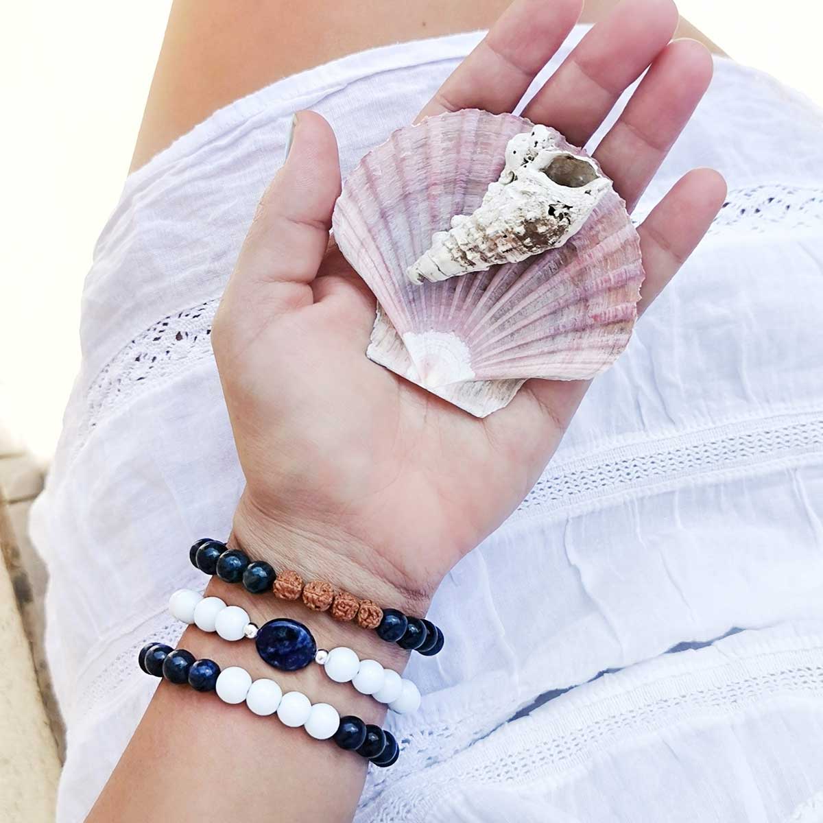 Narukvica s dumortieritom i rudrakšom pomaže da zadržiš mir usred oluje. Ova kombinacija daje unutarnju stabilnost i smirenost, pomaže ti da sagledaš situacije ispravno i da otpustiš sve što ti više ne služi. Zaštitit će te od negativnih energija i dati hrabrost da se zauzmeš za sebe.
