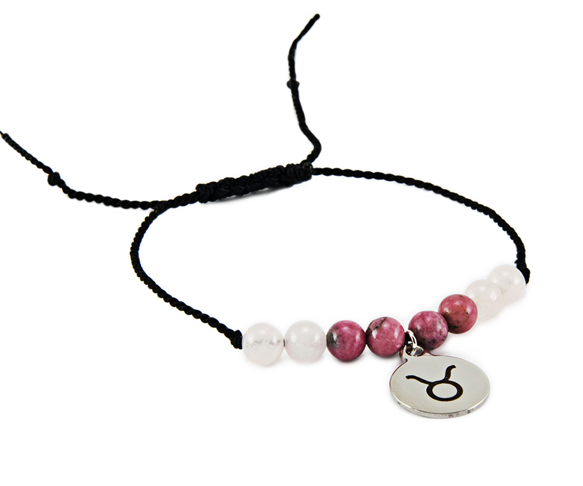 Materijali: netretirano poludrago kamenje 6 mm: rozenkvarc i rodonit, svila i metalni element od oplemenjenog čelika.