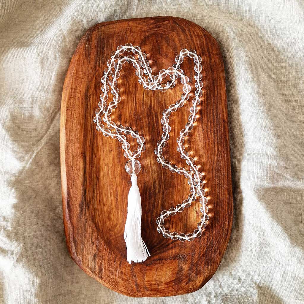 Materijali: netretirano poludrago kamenje: gorski kristal 8 mm i 10 mm, 100% svileni konac visoke kvalitete, zlatni/biljeli tassel.