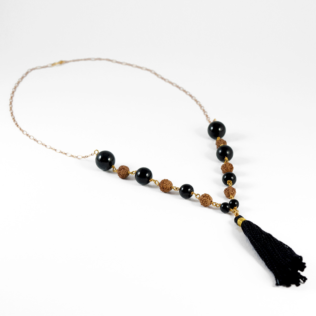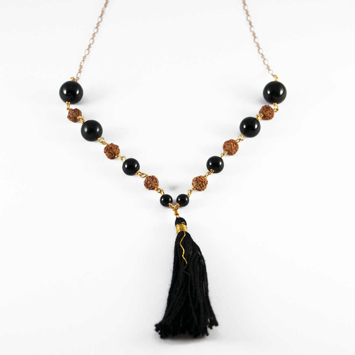 Materijali: netretirano poludrago kamenje AAA kvalitete: crni turmalin 12,10, 8, 6 mm, netretirana prirodna zrna rudrakše 6-7mm, visokokvalitetna pozlaćena žica s 14K zlatom, brončani lančić, svileni cuflek, kopča