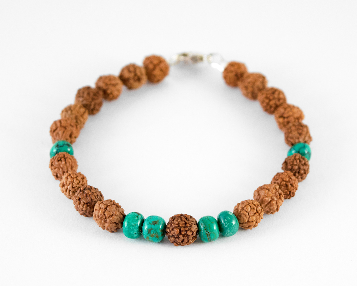 Materijali: pravi prirodni netretirani tirkiz A kvalitete 6 mm, certificirana prirodna netretirana zrna rudrakše 7mm, sajla, .925 srebrna kopča.