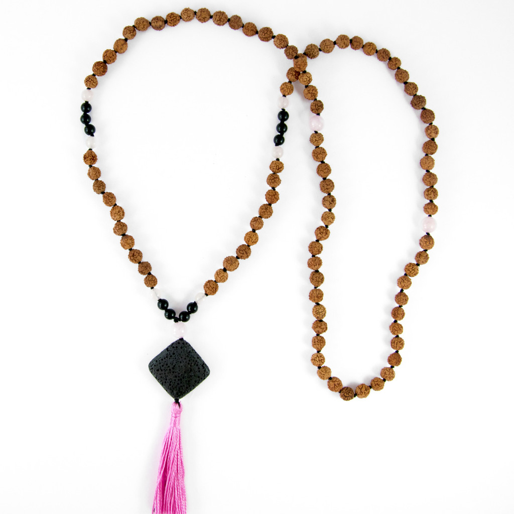 Materijali: netretirano poludrago kamenje: crni turmalin 6mm, rozenkvarc 6 i 8 mm i velika perla crne lave, certificirana prirodna netretirana zrna rudrakše 7 mm, 100% svileni konac visoke kvalitete, rozi cuflek.