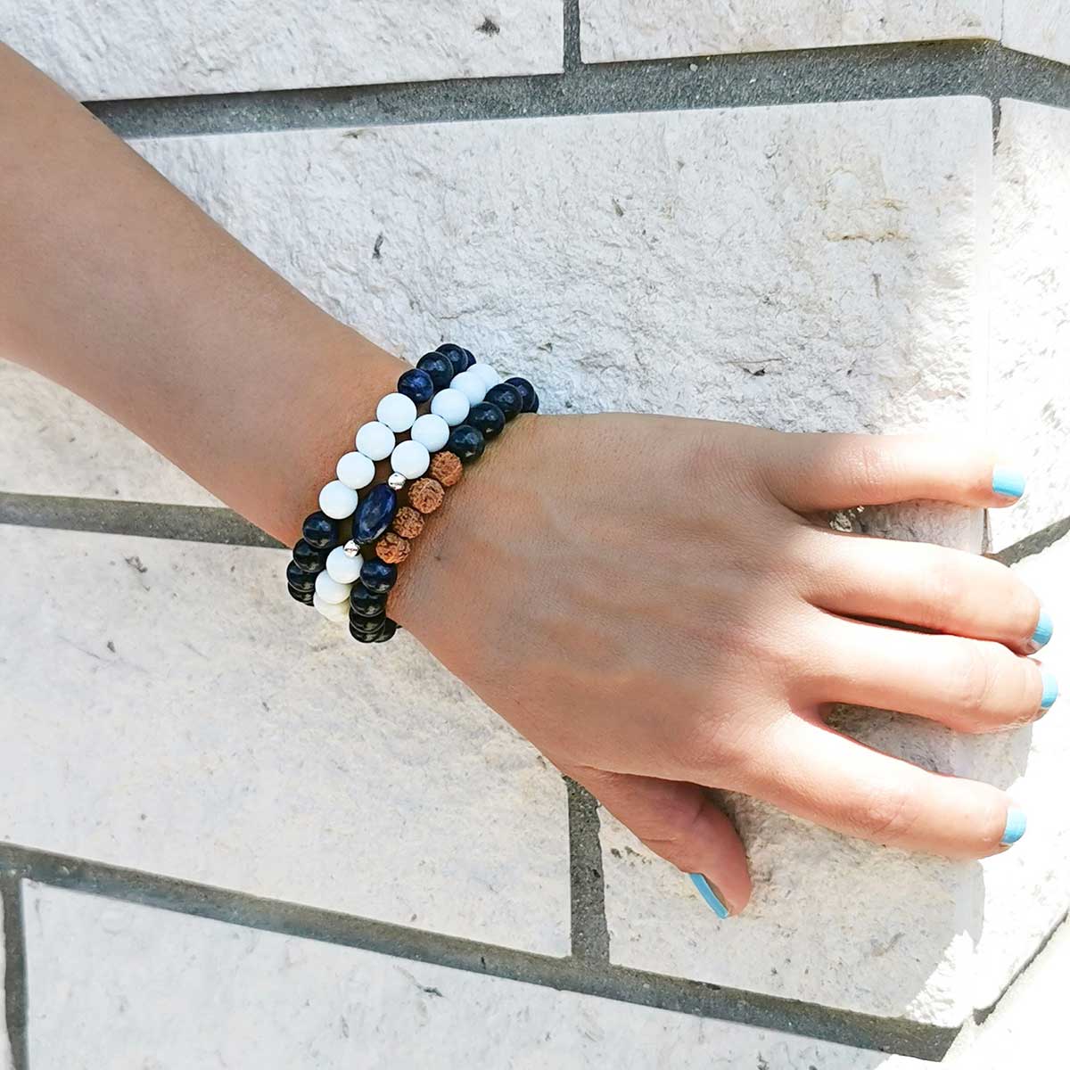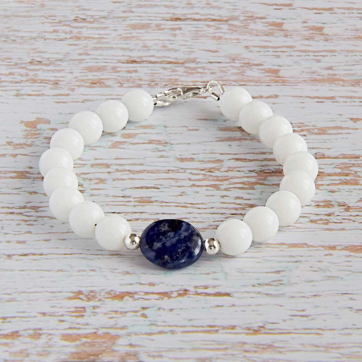 Materijali: netretirano poludrago kamenje A kvalitete: bijeli ahat 8mm, perla sodalita 12mm x 14mm, .925 srebrne perlice 4 mm, sajla, kopča.
