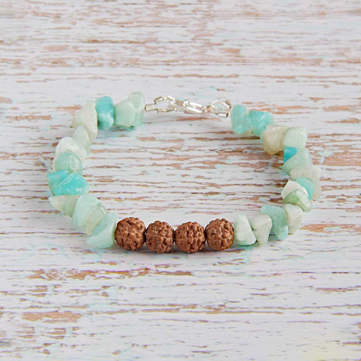 Narukvica s amazonitom i rudrakšom budi osjećaj slobode i neopterećenosti, kao kad hodaš plažom bosa, mokre kose i slane kože… i potpuno uživaš u sadašnjem trenutku. Ova kombinacija budi osjećaj bezbrižnosti, opuštenosti i radosti, uklanjajući napetost i brige.