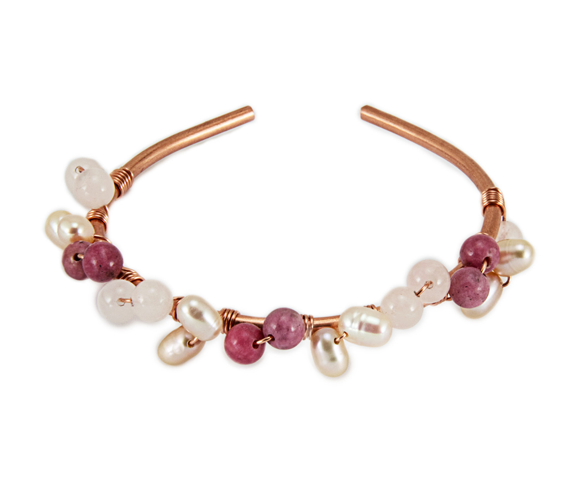Materijali: netretirano poludrago kamenje 6mm: rodonit, rozenkvarc i rozi ovalni biseri, bakar