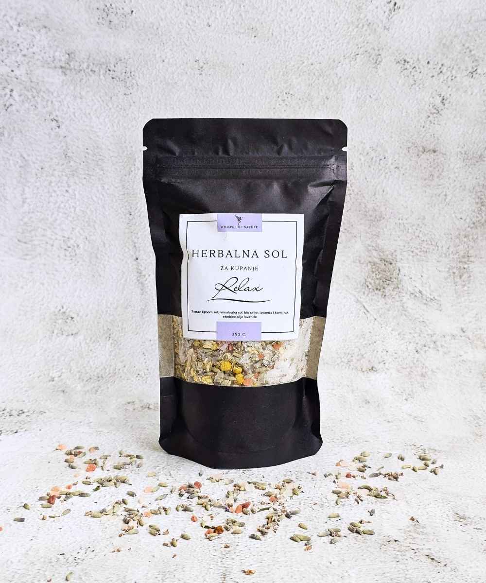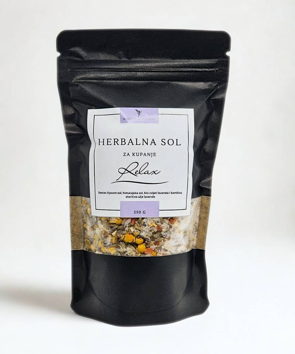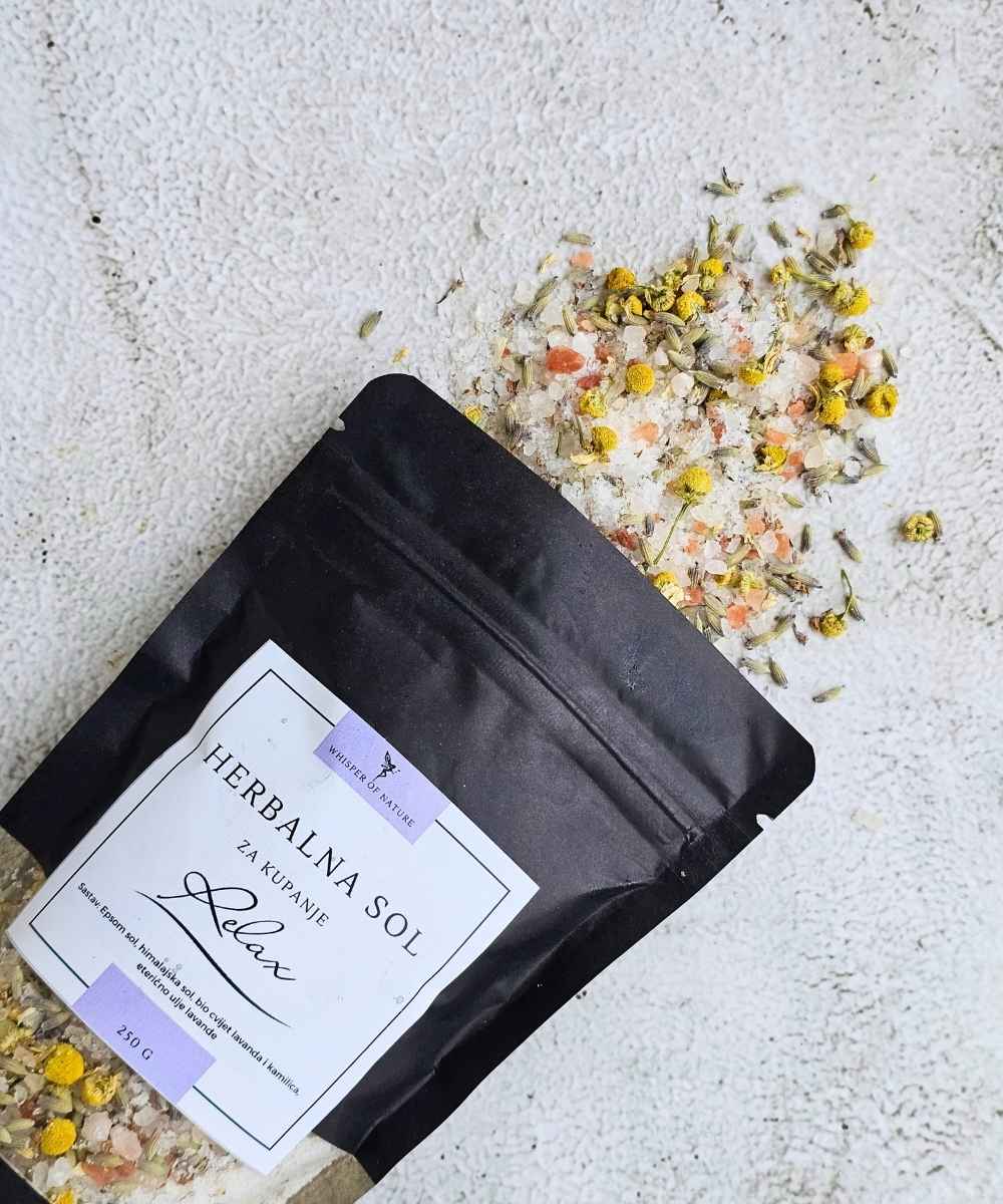 Sastav: Cvjetovi lavande, cvjetovi kamilice, eterična ulja, krupna roza himalajska sol, epsom sol.