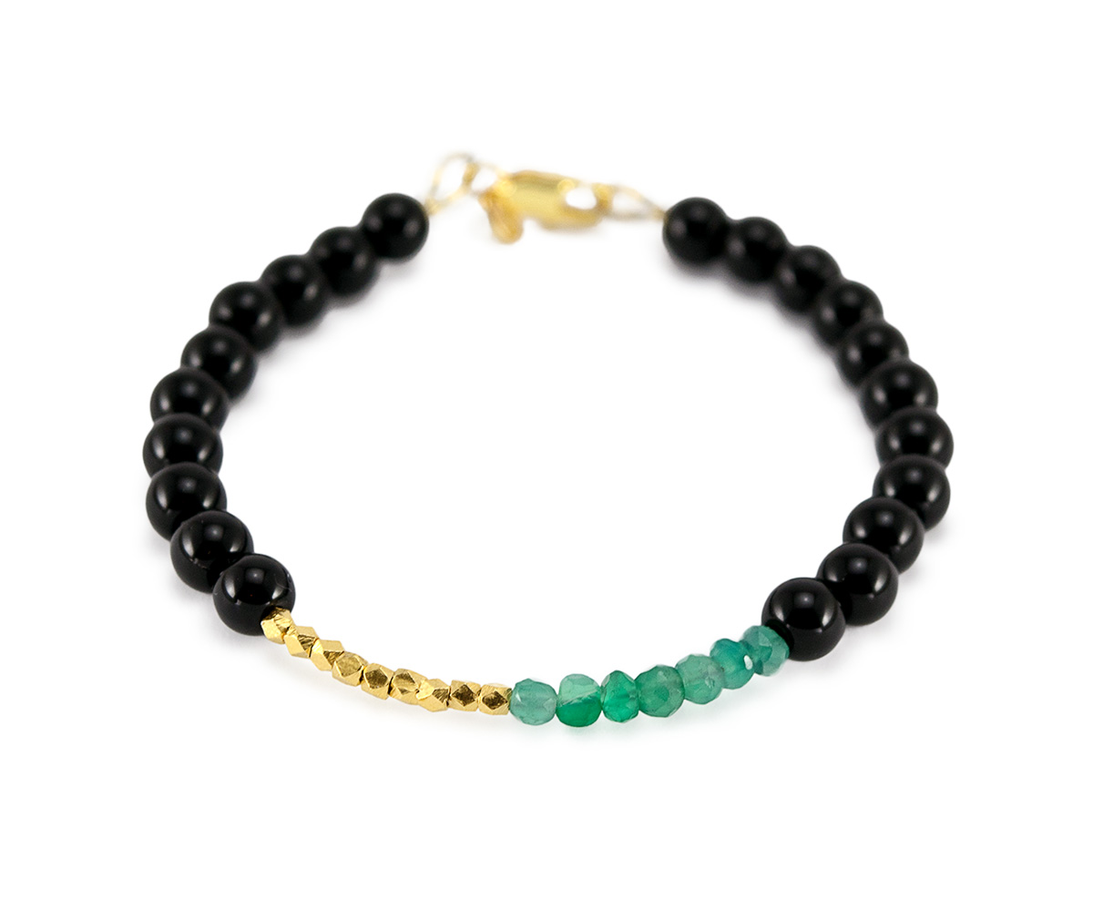 Materijali: netretirano poludrago kamenje A kvalitete: crni opsidijan 6 mm, facetirani zeleni oniks, 24 K pozlaćene facetirane perle 3mm, certificirana prirodna netretirana zrna rudrakše 6-7 mm, sajla, kopčica.