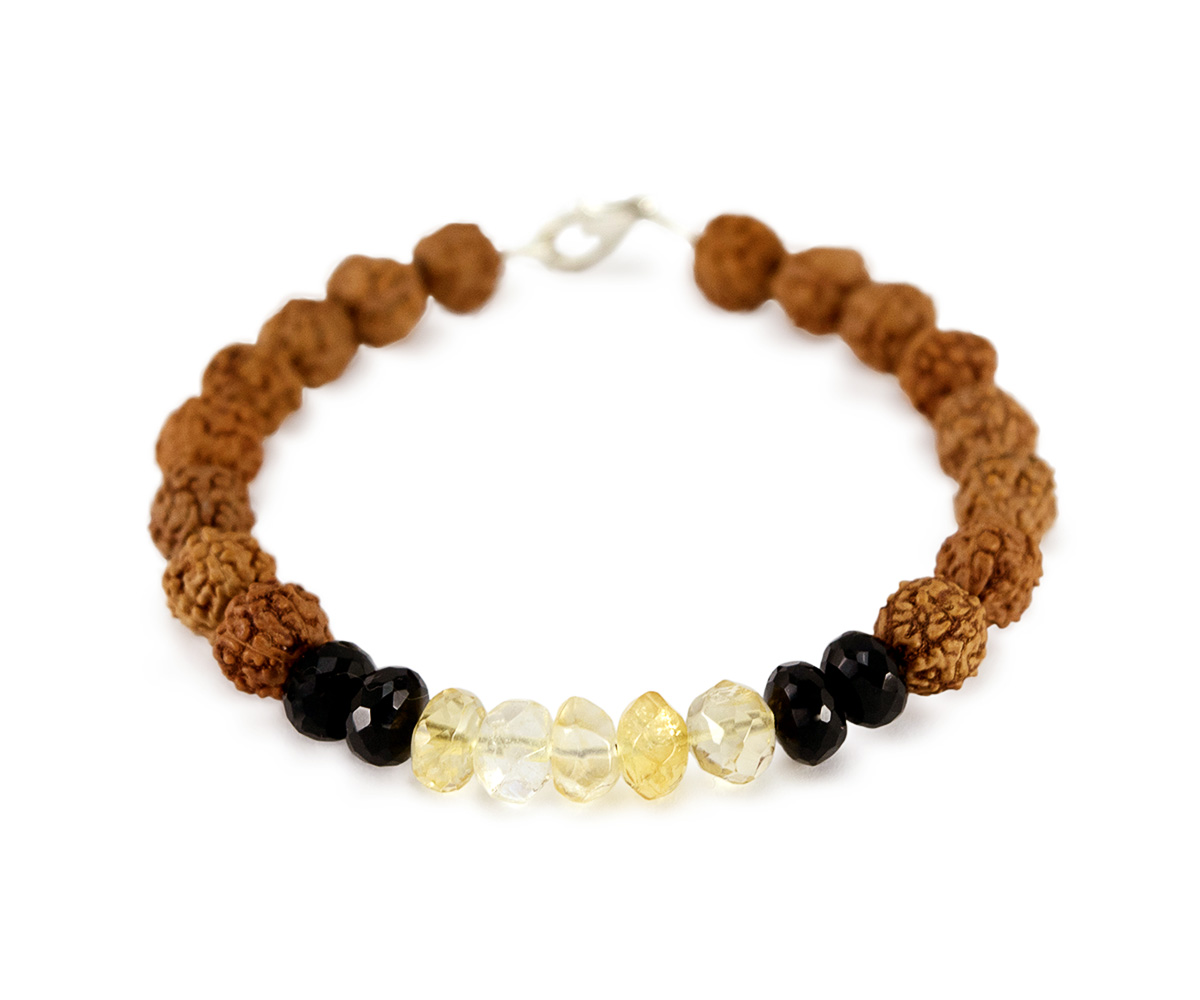 Materijali: netretirano poludrago facetirano kamenje A kvalitete: crni turmalin 5 x 8 mm, citrin 5 x 8 cm,  certificirana prirodna netretirana zrna rudrakše 6-7 mm, sajla, kopčica.