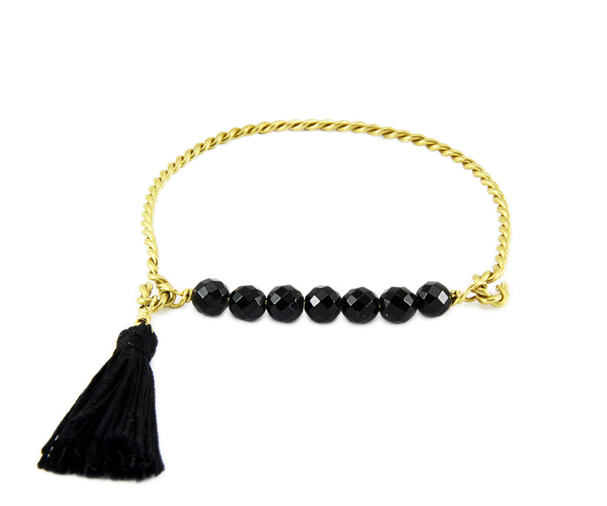 Materijali: ručno frkana mjedena žica, facetirani netretirani oniks AA kvalitete 6mm, svileni crni tassel