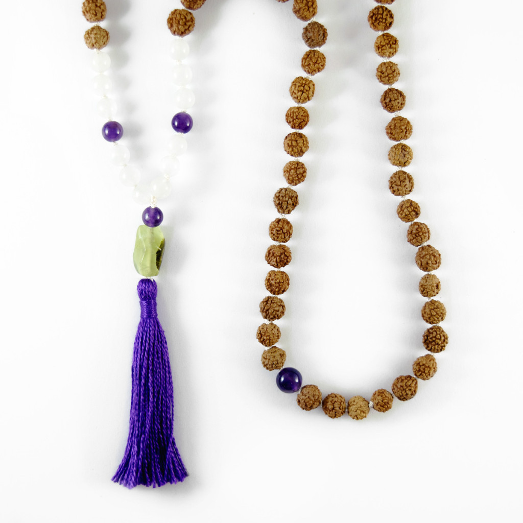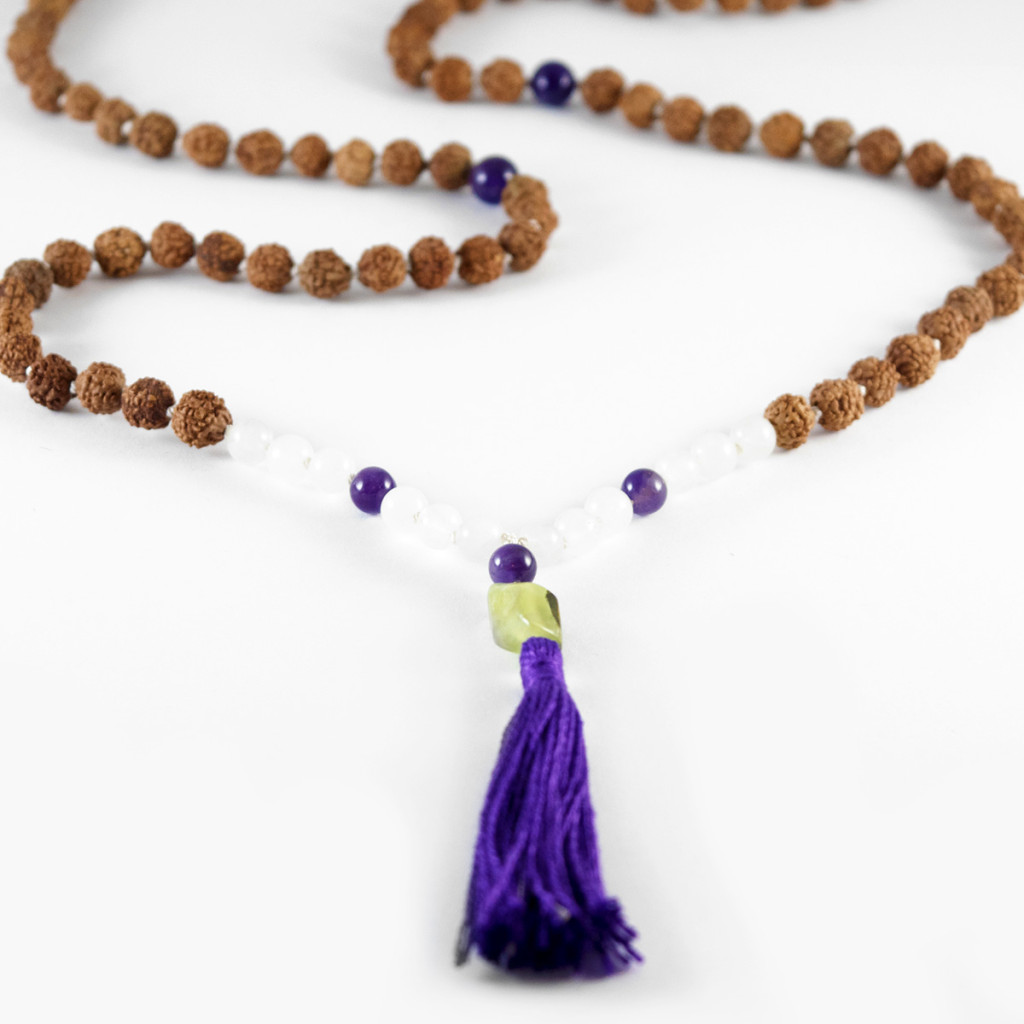 Māla s rudrakšom, prehnitom, ametistom i snježnim kvarcom ima snažno i istovremeno nježno umirujuće djelovanje. Okreće nas prema unutra, budi unutarnju mudrost i mir te potiče pozitivno stanje duha.