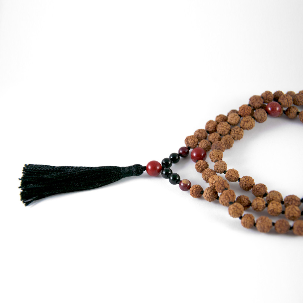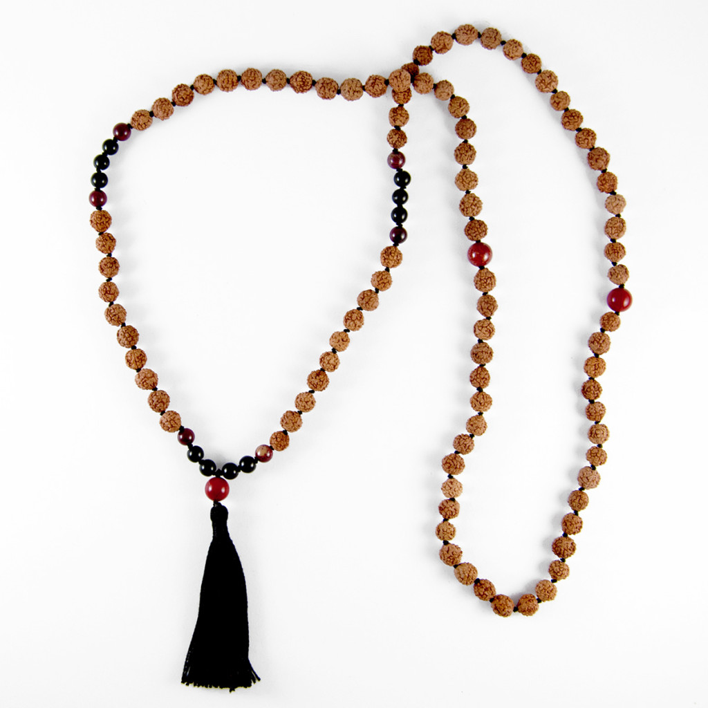 Materijali: netretirano poludrago kamenje: crveni jaspis 6 i 8 mm, crni turmalin 5-6 mm, certificirana prirodna netretirana zrna rudrakše 7 mm, 100% svileni konac visoke kvalitete, crni cuflek.